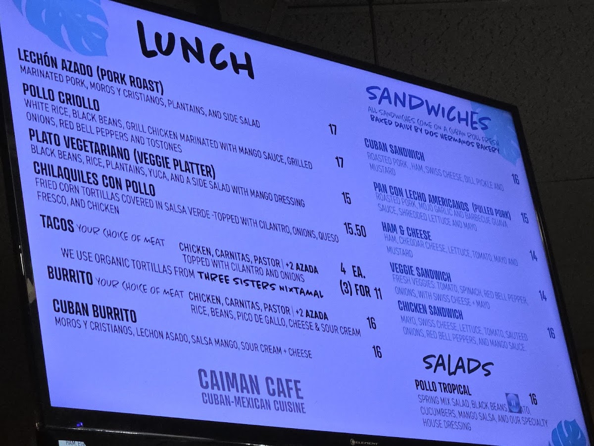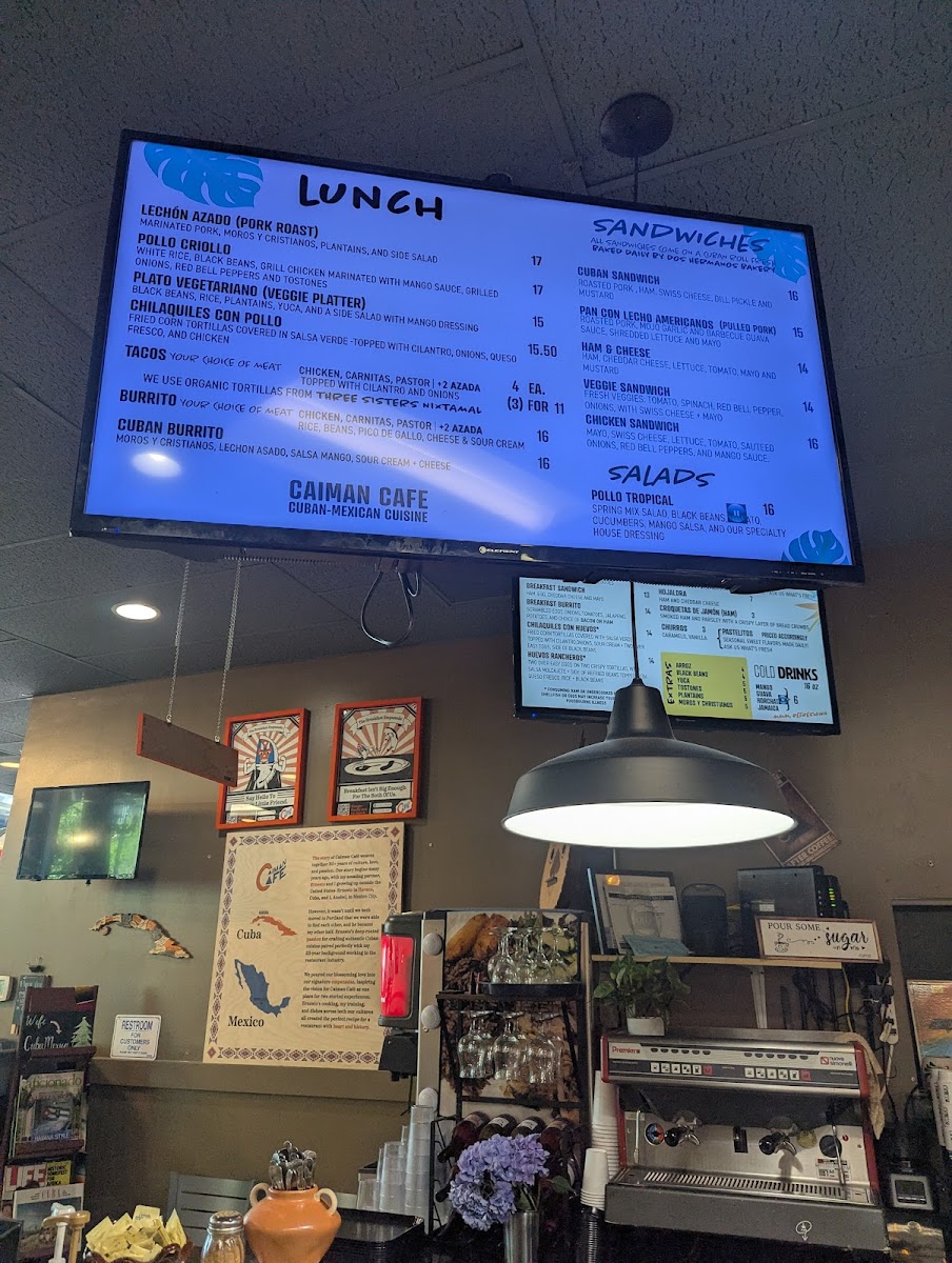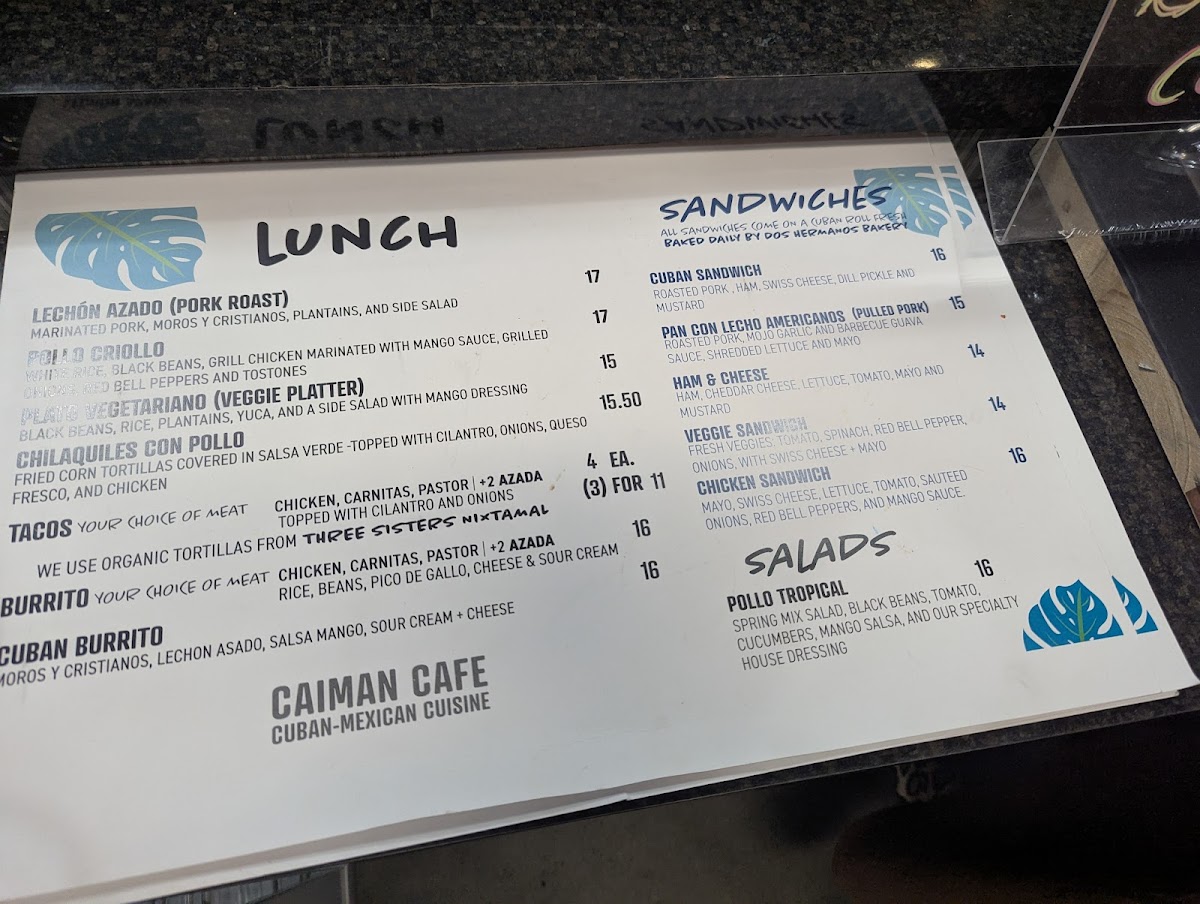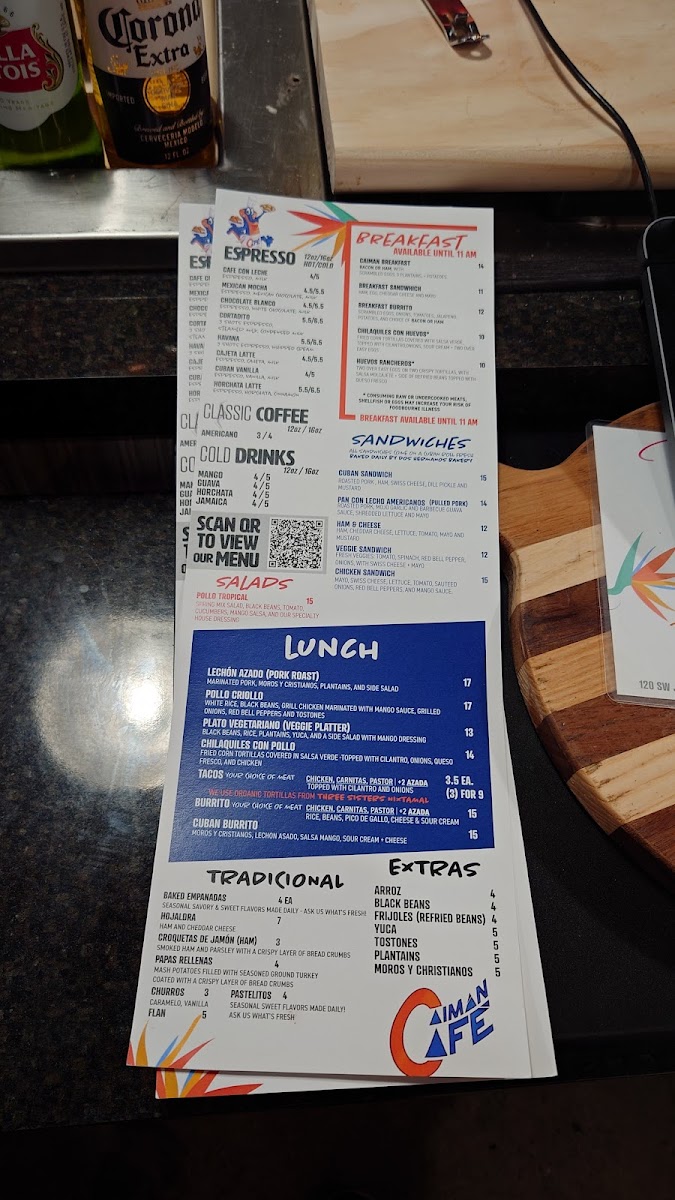 The menu at Caiman Cafe offers a delightful mix of Cuban and Latin-inspired dishes that cater to a variety of tastes. For breakfast, you can enjoy hearty options like the Caiman Breakfast or the flavorful Breakfast Sandwich. If you're in the mood for something different, try the Breakfast Burrito or the Chilaquiles con Huevos, both perfect for a fulfilling start to your day. The sandwich section is equally tempting, featuring the savory Cuban Sandwich, Pan con Leco Americanos (Pulled Pork), and the classic Ham & Cheese. Vegetarians can opt for the Veggie Sandwich, while the Chicken Sandwich offers a satisfying protein-packed choice. For lunch, dishes like the Lechon Azado (Roasted Pork) and Pollo Crioyo are standout options, and the Chilaquiles con Pollo provides a comforting, flavorful experience. The tacos, priced at 3 for $9, and Burrito round out the main meals. On the side, the Arroz, Frijoles (Refried Beans), and Yuca Tostones are excellent accompaniments. Don't miss the traditional Cuban-inspired drinks like Cafe con Leche, the rich Mexican Mocha (16 oz), or the refreshing Horchata Latte (16 oz). For a sweet finish, try the Churros or Pastelitos, perfect alongside a cold drink like Guava (16 oz) or Horchata (16 oz). Whether you're here for breakfast, lunch, or a casual snack, Caiman Cafe has something to satisfy every craving.