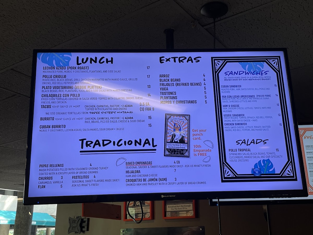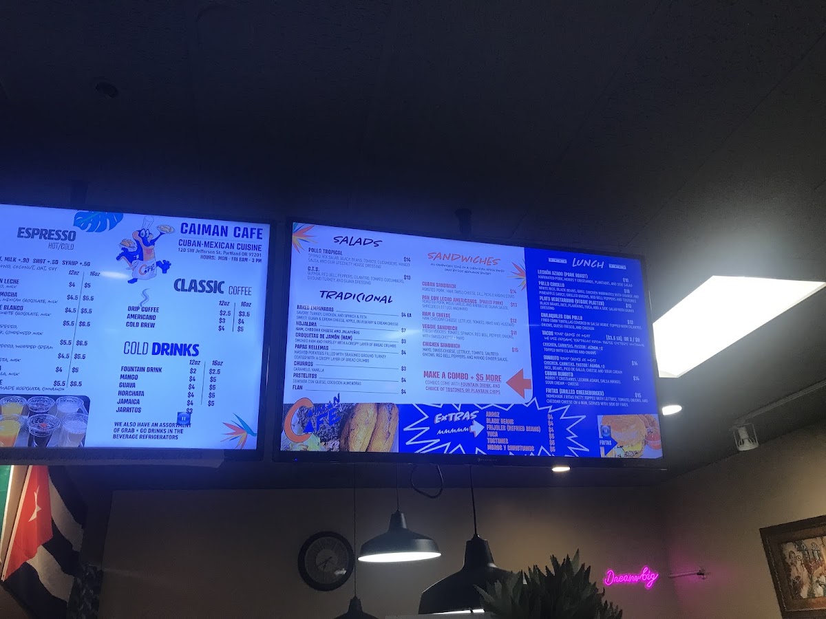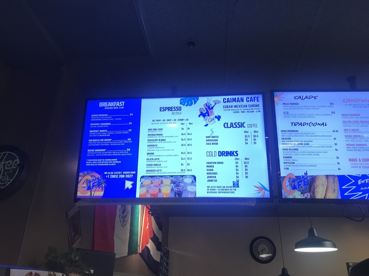 The menu at Caiman Cafe offers a delightful mix of Cuban and Latin-inspired dishes that cater to a variety of tastes. For breakfast, you can enjoy hearty options like the Caiman Breakfast or the flavorful Breakfast Sandwich. If you're in the mood for something different, try the Breakfast Burrito or the Chilaquiles con Huevos, both perfect for a fulfilling start to your day. The sandwich section is equally tempting, featuring the savory Cuban Sandwich, Pan con Leco Americanos (Pulled Pork), and the classic Ham & Cheese. Vegetarians can opt for the Veggie Sandwich, while the Chicken Sandwich offers a satisfying protein-packed choice. For lunch, dishes like the Lechon Azado (Roasted Pork) and Pollo Crioyo are standout options, and the Chilaquiles con Pollo provides a comforting, flavorful experience. The tacos, priced at 3 for $9, and Burrito round out the main meals. On the side, the Arroz, Frijoles (Refried Beans), and Yuca Tostones are excellent accompaniments. Don't miss the traditional Cuban-inspired drinks like Cafe con Leche, the rich Mexican Mocha (16 oz), or the refreshing Horchata Latte (16 oz). For a sweet finish, try the Churros or Pastelitos, perfect alongside a cold drink like Guava (16 oz) or Horchata (16 oz). Whether you're here for breakfast, lunch, or a casual snack, Caiman Cafe has something to satisfy every craving.